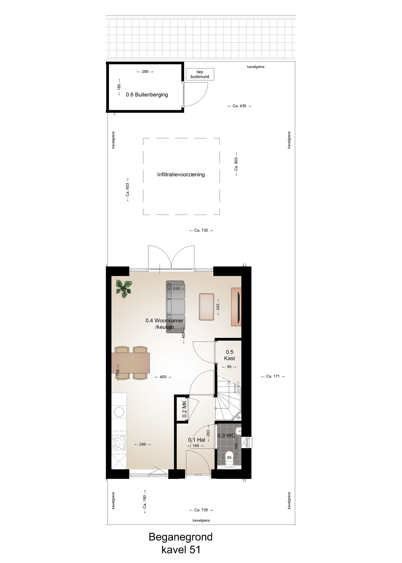 begane grond, waar zich het toilet en de trap naar de 1e verdieping bevinden, betreedt