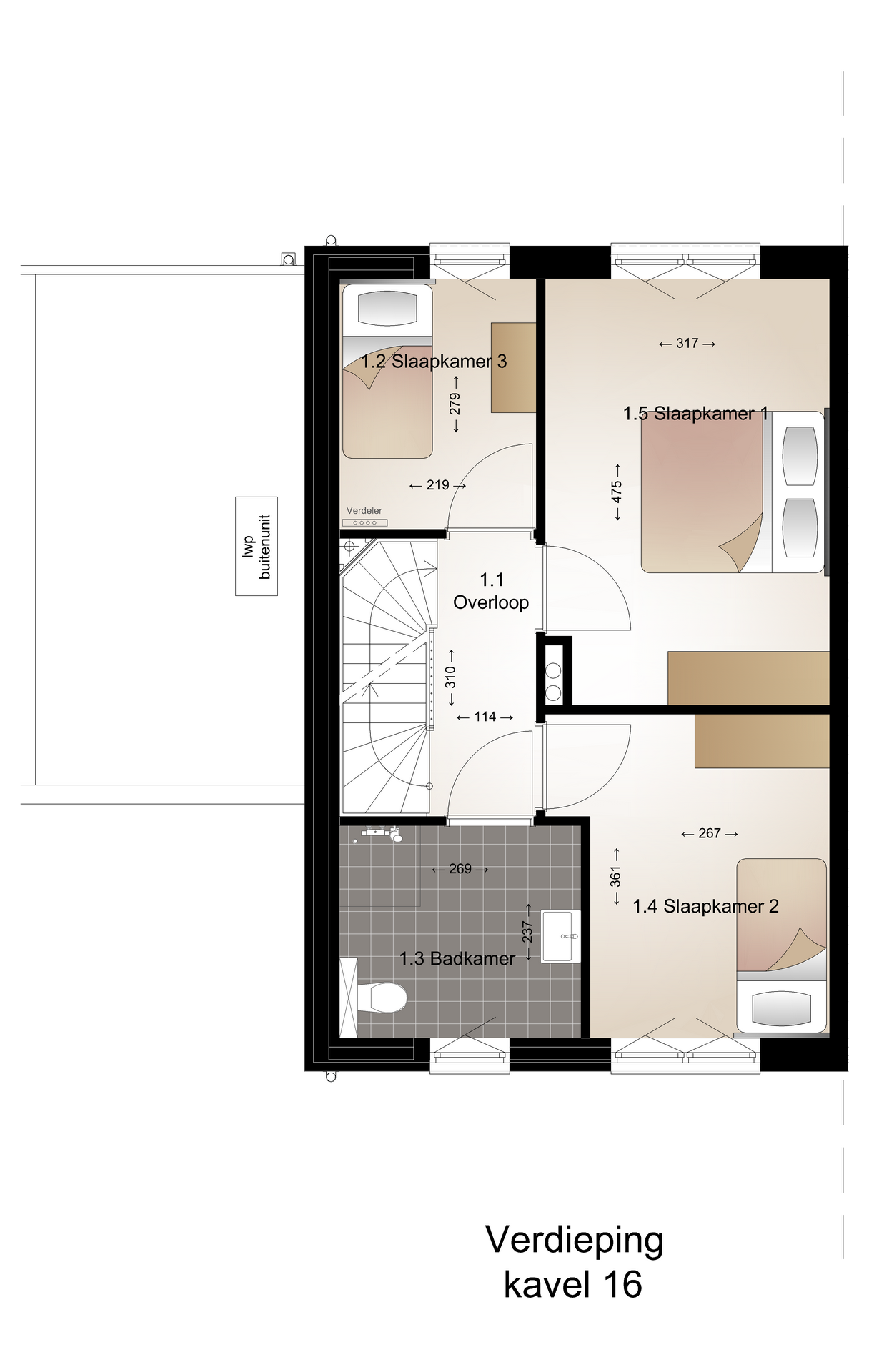 verdieping bevinden zich 3 slaapkamers en de badkamer. De vaste trap naar de zolder